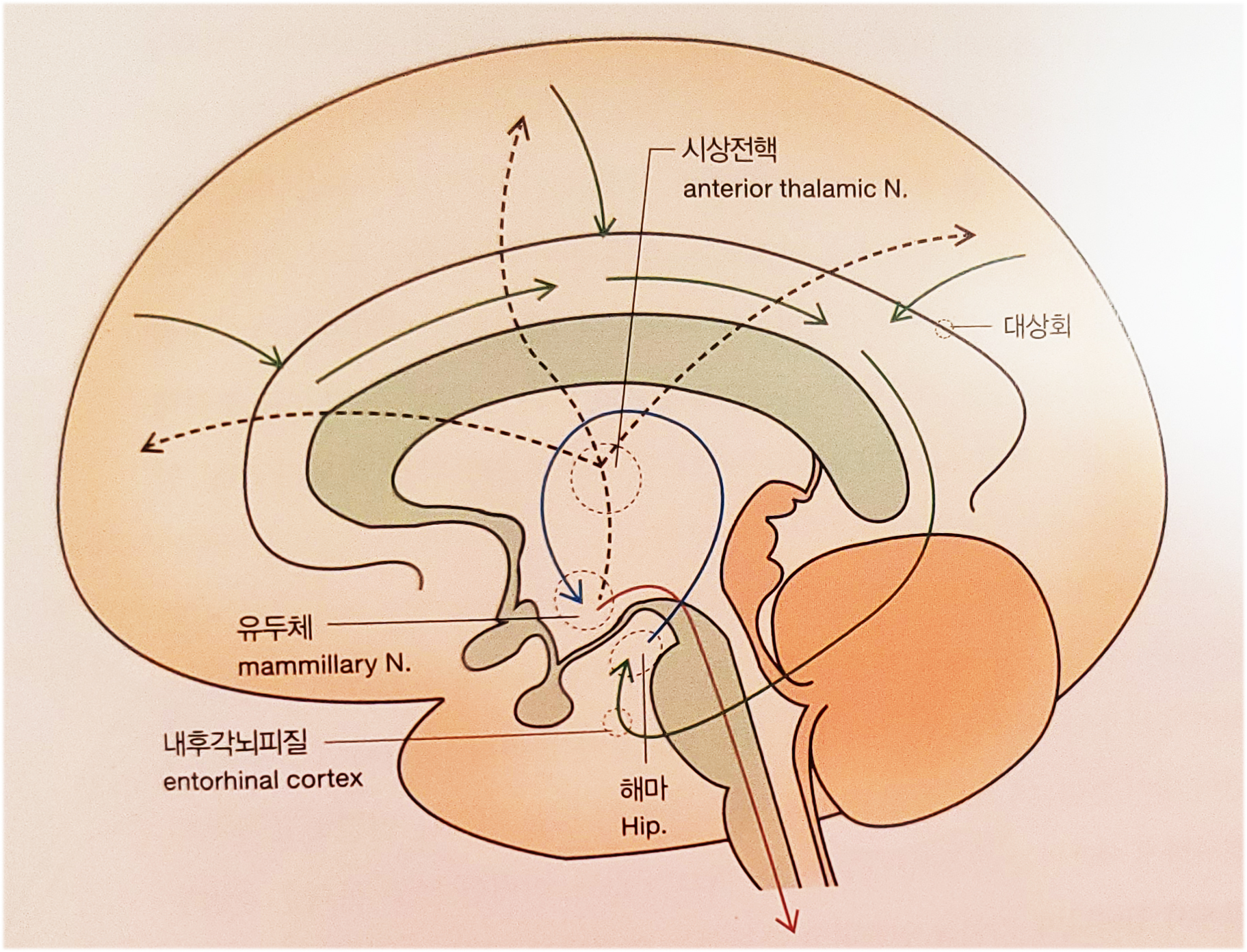 해마술은 뇌궁이 되어 유두체로 입력되고, 유두체⟶유두시상로⟶시상전핵⟶내낭전지⟶대상회로 이어지는 신경회로가 형성된다. 대상회와 신피질은 상호연결되어 해마에서 형성된 기억이 대뇌신피질에 저장된다. 시상부와 연결된 중격핵에서 기억 형성 파페츠회로가 서로 연결되어 기억 회로와 감정 회로가 서로 연결된다. 결국 감정적인 사건은 기억이 강화된다.