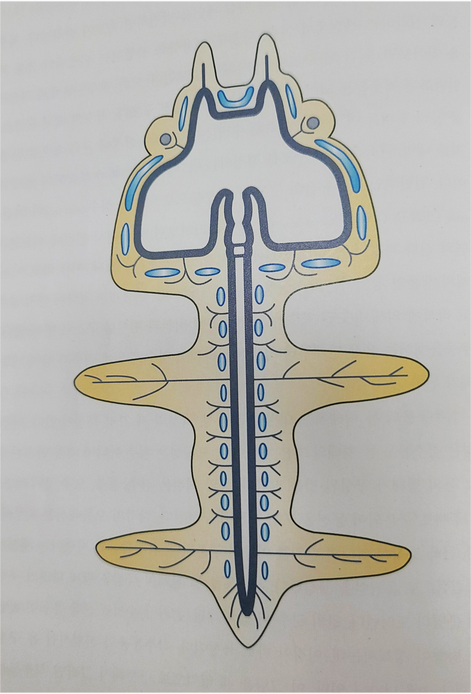 중추신경계를 그린다음 말초신경인 뇌신경과 척수신경 가지가 뼈사이로 빠져 나오게 하며 피부로 머리뼈와 척추뼈를 둘러싸서 몸전체 윤곽을 그린다. 이 그림의 묘미는 척수와 대뇌가 융합되면서 척추동물의 전형적인 몸형태가 완성되는 과정에 있다.