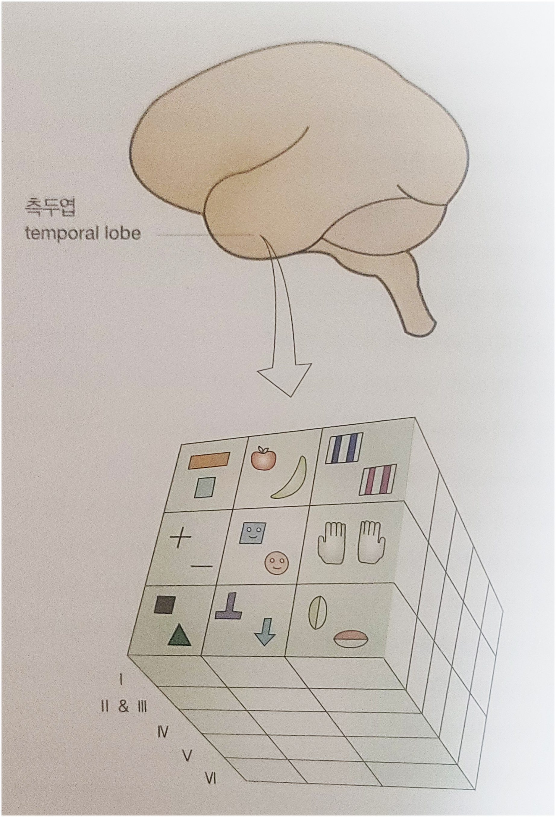 후두엽의 일차시각피질에서 모인 시각 신경 자극 전압파는 하측두엽에 도달하는 과정에서 많은 단계별 처리 결과로 형태와 색채의 항등성을 얻게된다.