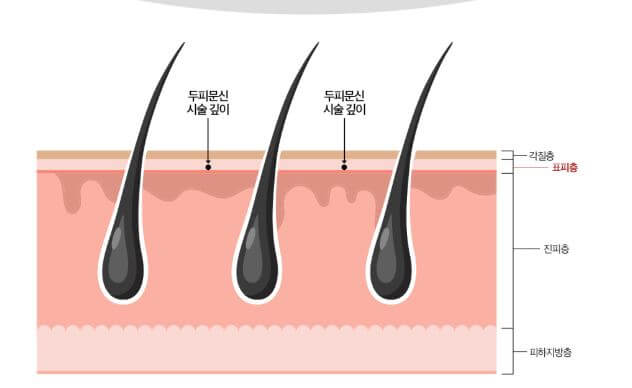 한국인의 평균 모낭깊이가 4~6mm정도인데 두피문신의 깊이는 0.8~1.5mm 정도여서 기존 모낭의 손상없이 시술이 가능하기 때문에 기존모의 탈락이나 탈모의 악화등을 걱정하실 필요는 없습니다.