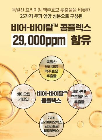 구체적으로 이번 제품에는 독일산 프리미엄 맥주효모 추출물과 25가지 두피영양 성분으로 구성된 '비어 - 바이탈 콤플렉스' 2만9000ppm이 포뮬러에 함유되어 있습니다. 또 건강한 두피를 위해 비듬제거와 각질 케어에 도움이 되는 BHA성분도 첨가했습니다. 개운한 사용감이 특징으로 인체 적용시험을 거쳐 사용 7일후 두피의 수분량이 23% 개선되고, 건조로 인한 두피 가려움도 개선 된다는 것을 입증받았습니다.