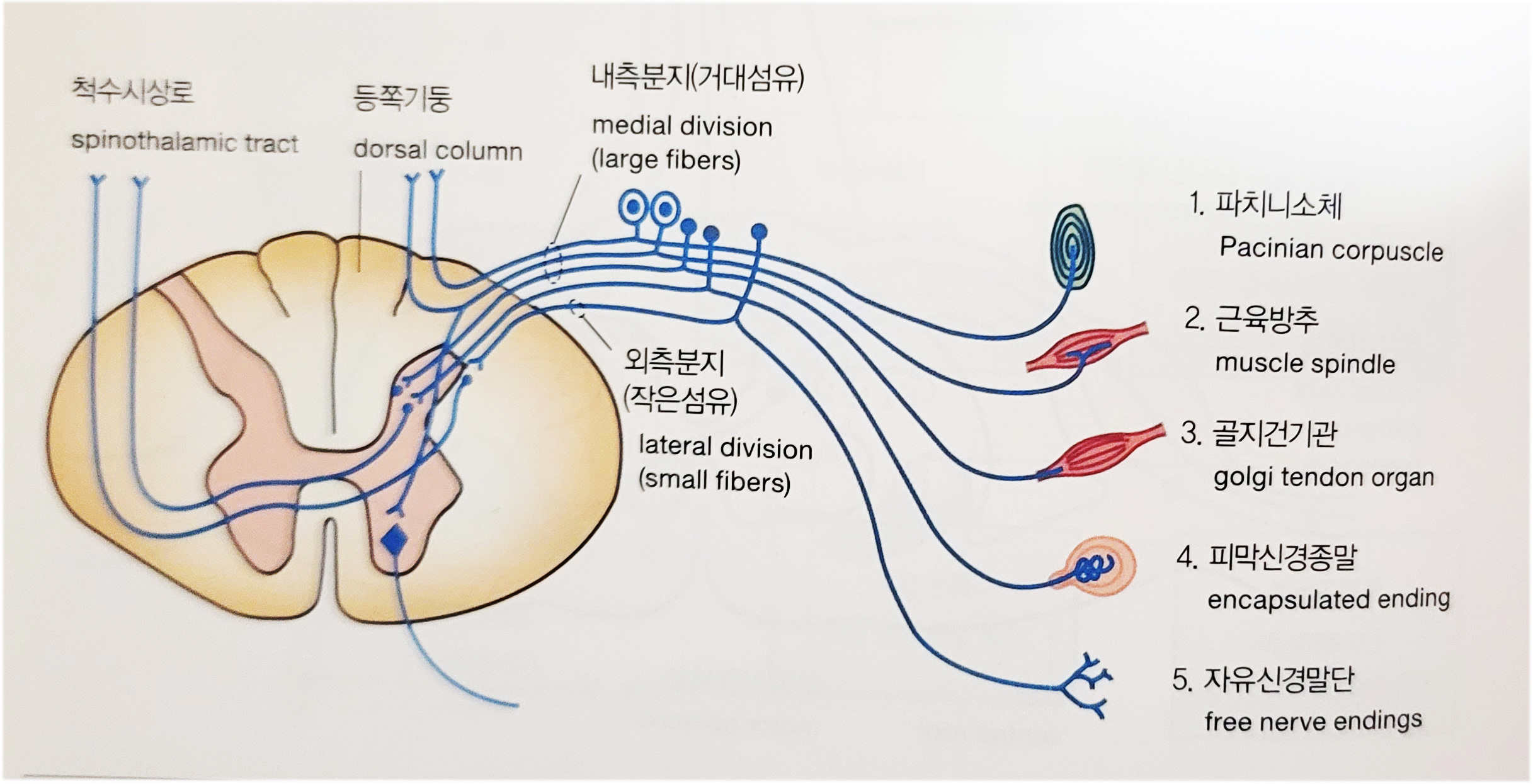 아래 <그림>에서 통증은 등쪽신경절을 구성하는 감각신경세포 축삭말단이 피부속에 노출된 자유말단종말의 흥분자극에서 시작되며, 막구조에 쌓여 있는 축삭말단에서 진동과 압력감각이 전달된다.