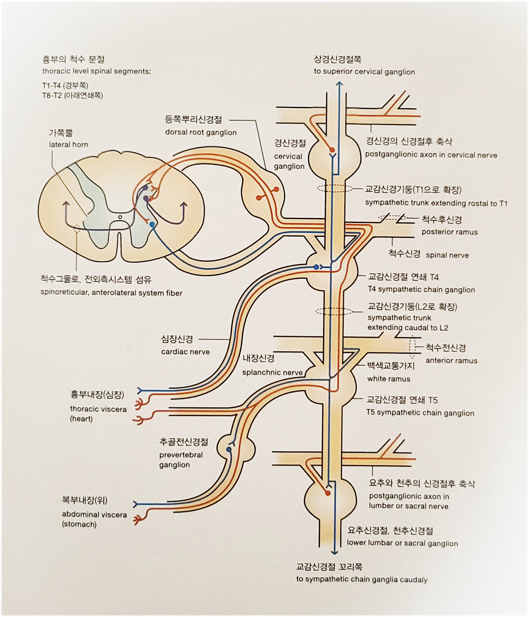 피부의 통증은 등쪽신경절 감각세포 축삭의 자유말단에서 입력되는 통각 신경흥분이 척수 중간뉴런을 통해 척수전각 알파운동뉴런으로 전달되고, 알파운동뉴런에서 골격으로 신경 흥분이 신속히 전달되어 자극원에서 회피하는 반사운동을 일으킨다. 척수의 마디마다 피부, 내장, 골격으로 신경이 연결되며, 척수 마디 단위로 신경 처리가 구분되어 신체분절을 조절한다. 경수, 흉수, 요수, 천수의 척추신경과 교감신경기둥의 상호연결이 아래 <그림> 과 같이 나타나 있다.